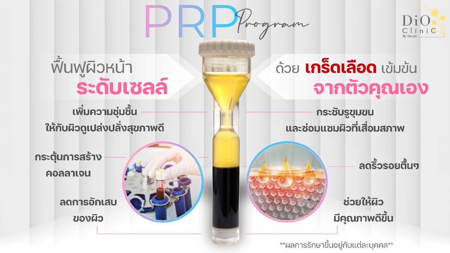 PRP หรือเกร็ดเลือดเข้มข้น เป็นสารที่ได้จากการนำเลือดของตัวเองมาปั่นโดยผ่านกรรมวิธีการเฉพาะในการปั่นเพื่อแยกชั้นของพลาสมา (Plasma) ที่มีลักษณะเป็นสีเหลืองใสออกมา โดยพลาสมาประกอบด้วยเกร็ดเลือด และแพทย์จะคัดแยกเกล็ดเลือดออกจากเม็ดเลือดและพลาสม่า ซึ่งในเกร็ดเลือดนี้จะมีความเข้มข้นสูงและประกอบด้วยสารต่างๆ รวมไปถึงสารกระตุ้นการเจริญเติบโต (Growth Factor) ซึ่งเป็นกลุ่มโปรตีนประเภทหนึ่งที่มีอยู่ในร่างกายเราเองมาฉีดกลับเข้าไปที่ผิวหน้า เพื่อรักษาปัญหาผิวพรรณ มีประโยชน์ในการช่วยซ่อมแซมเซลล์ผิว ลดการอักเสบ กระตุ้นคอลลาเจน ทำให้ผิวมีคุณภาพที่ดีขึ้น
